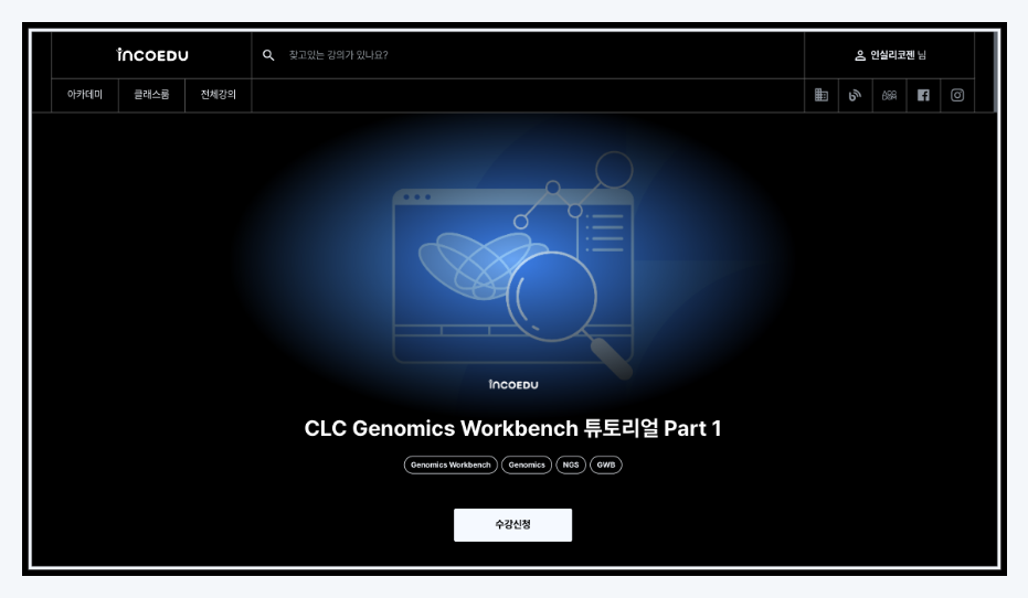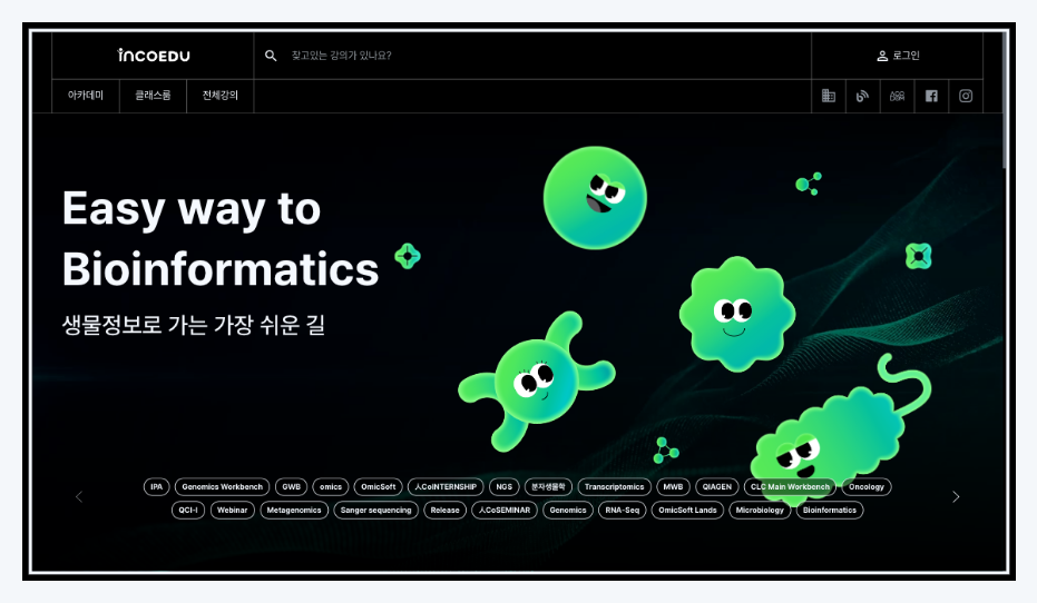 인코에듀는 생물정보 전문기업 (주)인실리코젠에서 운영하는 교육 콘텐츠들을 한곳에 모아 더욱 편리하게 이용할 수 있도록 만들어졌습니다.