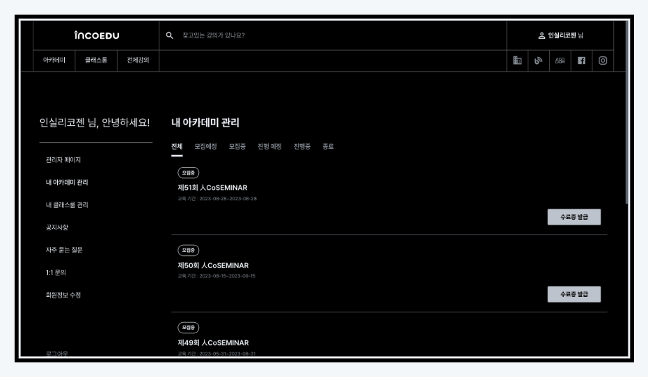 아카데미 탭에 인코세미나, 인코워크샵, 인코인턴십 중에 관심 가는 교육이 있다면 한번 신청해 보세요!