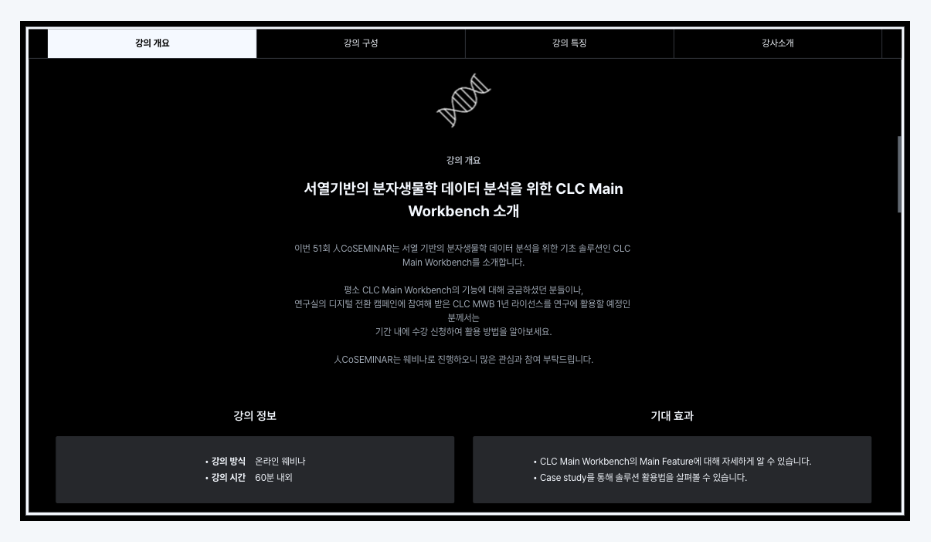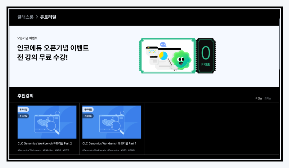 클래스룸에서는 생물정보 솔루션에 대한 튜토리얼 코스, 케이스 스터디, 프로그래밍 언어, 스낵 스터디를 제공하고 있습니다. 온라인으로 관심 있는 주제를 선택해 언제든 편하게 학습해 보세요!