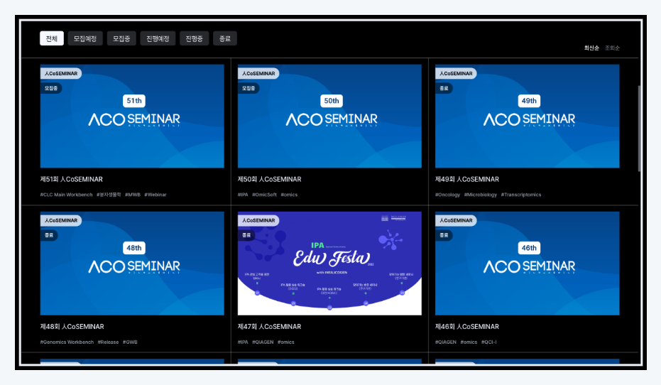 | [교육안내] 제50회 人CoSEMINAR - Biomarker Discovery and Disease Pathology Investigation using OmicSoft & IPA (0) | 2023.06.09 |