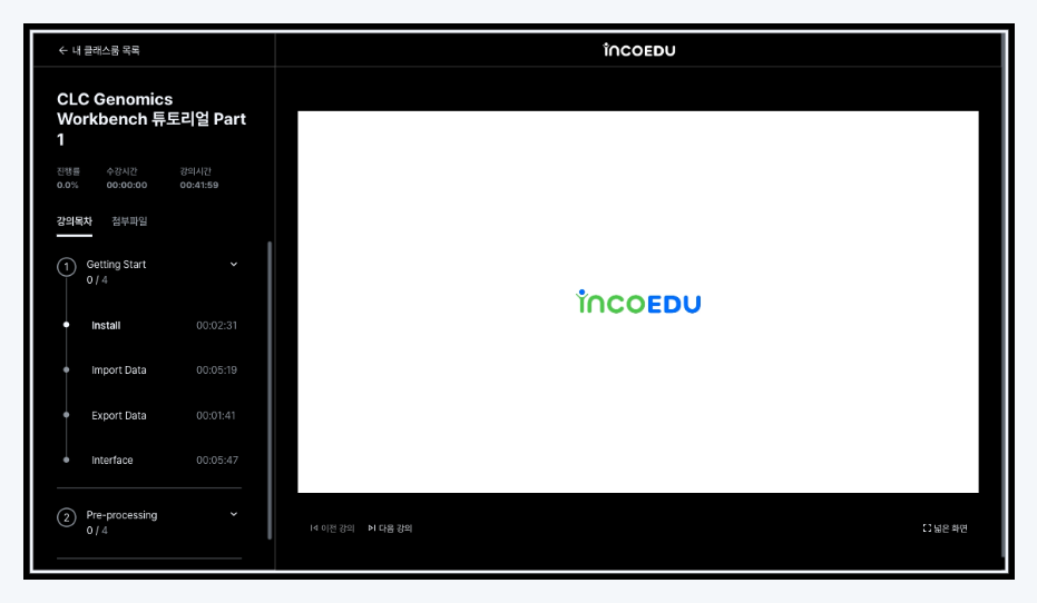 온라인 강의 플레이어에서는 왼쪽에 내가 수강 중인 코스 및 강의의 목차와 강의 시간을 확인할 수 있습니다. 각 항목을 클릭하면 플레이어에서 바로 재생할 수 있습니다.