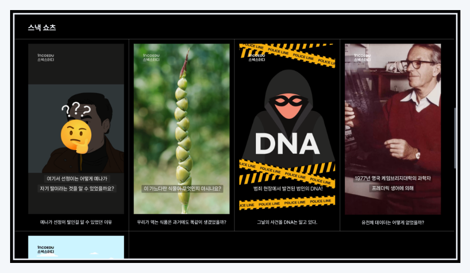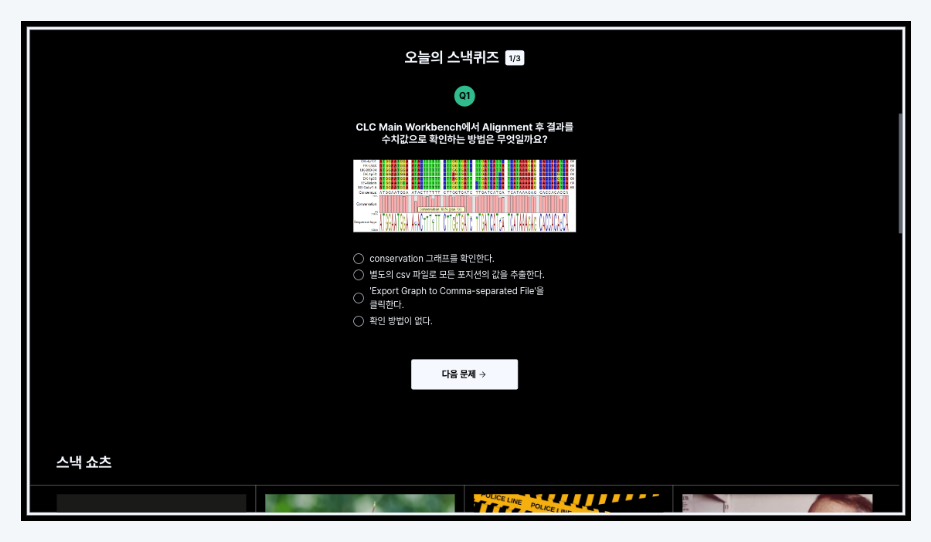 클래스룸에는 온라인 강의 이외에도 스낵 스터디 탭에서 생물정보에 관련된 퀴즈와 숏폼 콘텐츠를 볼 수 있으니 가볍게 학습하거나 머리를 식힐 겸 한번 들러보세요!