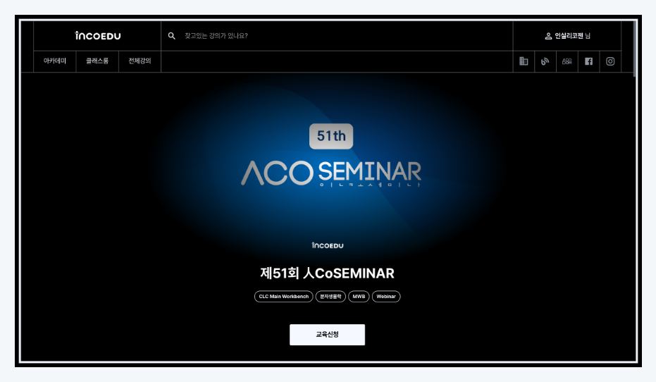 지원 일정 기간에 맞춰 교육신청 버튼을 클릭해 해당 인코세미나에 참여할 수 있습니다.