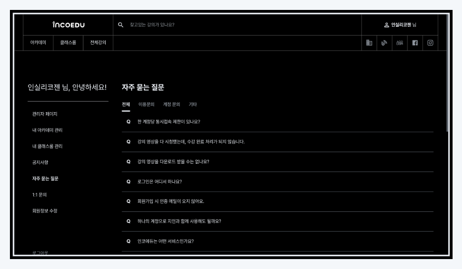 자주 묻는 질문에서는 인코에듀를 이용하며 궁금할 만한 내용에 대해 미리 답변을 준비해두어 기다림 없이 바로 답변을 확인할 수 있습니다.