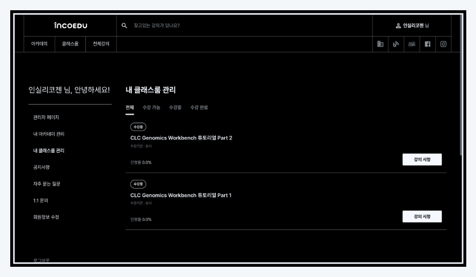 내 클래스룸 관리에서는 내가 신청한 클래스룸의 코스와 강의를 한 눈에 볼 수 있습니다.