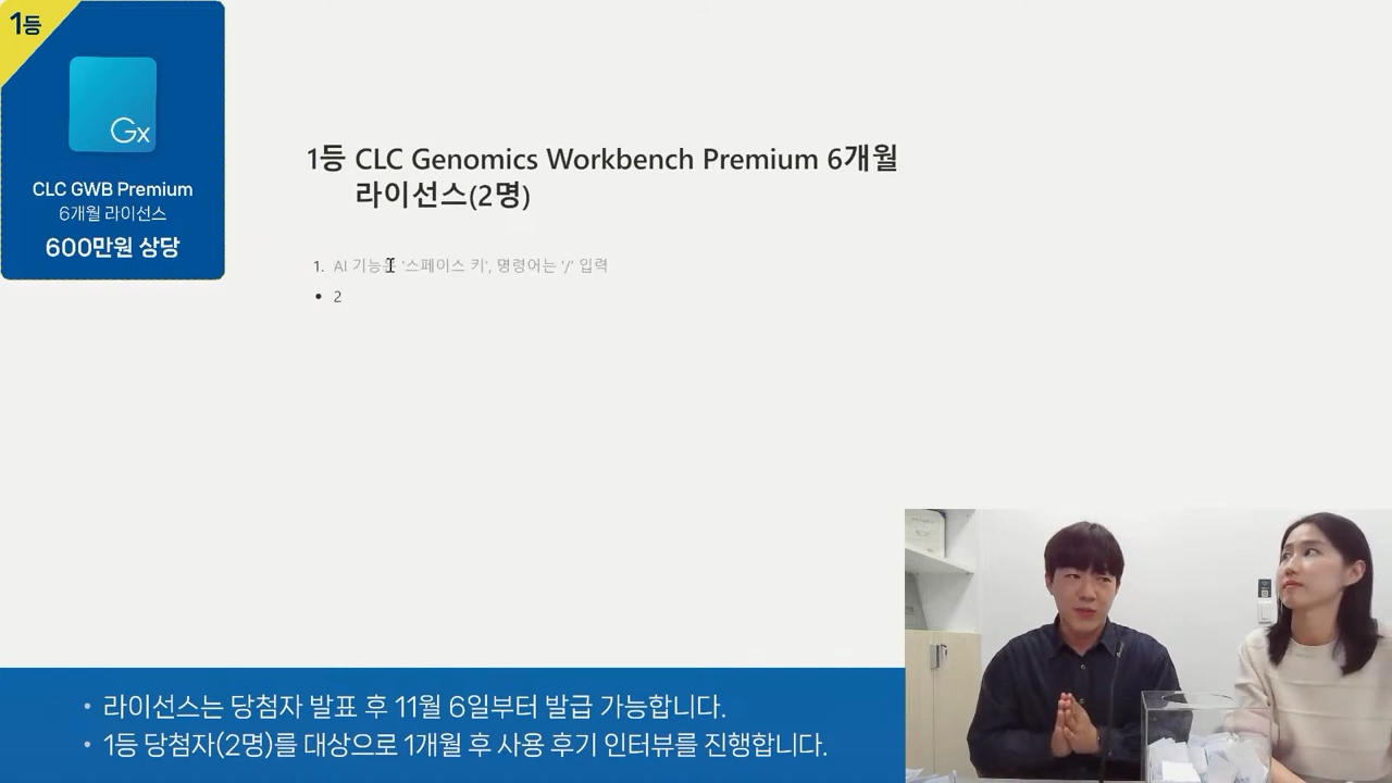 학회 종료 후, 10월 30일 오후 3시에 유튜브 라이브로 1등과 2등 랜덤 추첨이 진행되었습니다. 저희도 처음으로 라이브 이벤트를 진행하는 거라 많이 떨리기도 하고 재밌기도 했습니다. 😊 이렇게 추첨 이벤트로 CLC Genomics Workbench 6개월 라이선스에 당첨되신 2분과 CLC Main Workbench 1년 라이선스에 당첨되신 30분께 개별로 컨택을 드렸습니다.