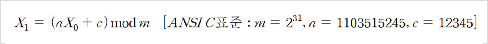 C의 rand( ) 함수에서 사용하는 알고리즘이며 계산이 빠르고 간단하기에 예전부터 널리 사용되었습니다. 하지만 문제는 ANSI C 표준으로 변수들이 정해져 있어, 이전 결과를 기반으로 다음 rand 함수의 결과를 예측할 수 있죠.