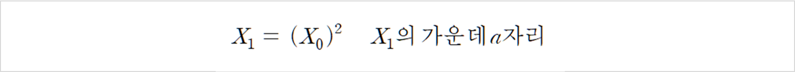 1949년 폰 노이만이 고안한 의사 난수 생성 방식입니다. 초기의 값(Seed)을 거듭제곱하고 가운데 a 자리의 수만큼 추출하는 방법입니다. 생성한 난수의 품질이 좋지 않아 현재에는 잘 사용하지 않습니다.