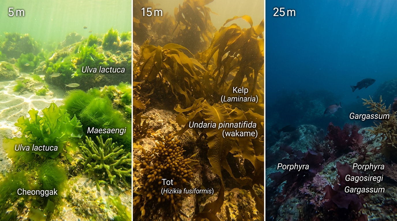 수심에 따른 해조류 분류(출처: 구글 Flow 이미지 생성)
