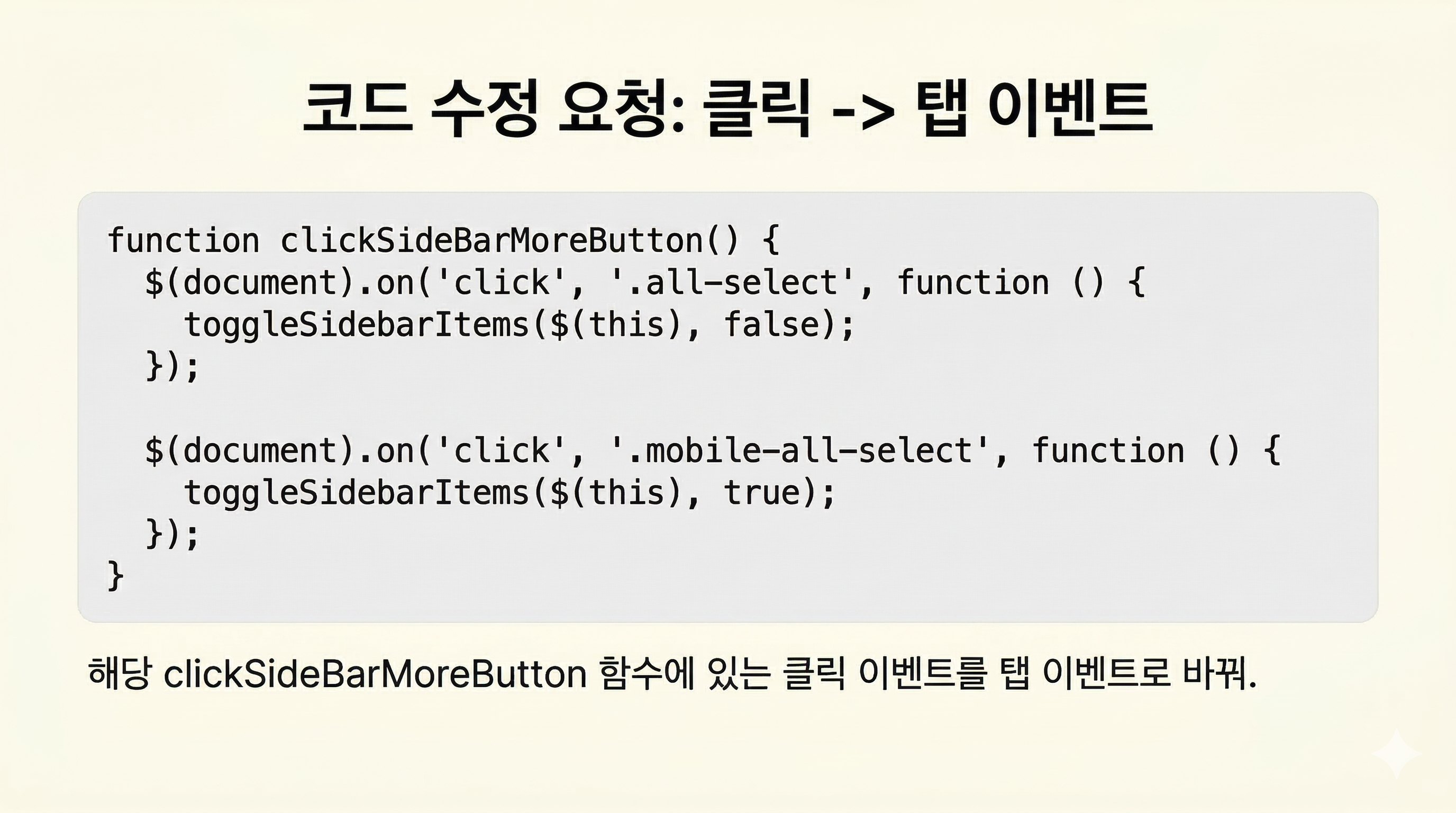 만약 동일한 기능을 가진 코드라면 하나의 코드 블록으로 묶을 수 있지만, 문법이 다른 코드(예: HTML, SCSS)나 목적이 다른 코드(예: 여러 함수) 일 경우 각각 별도의 코드 블록으로 작성하는 것을 권장합니다.