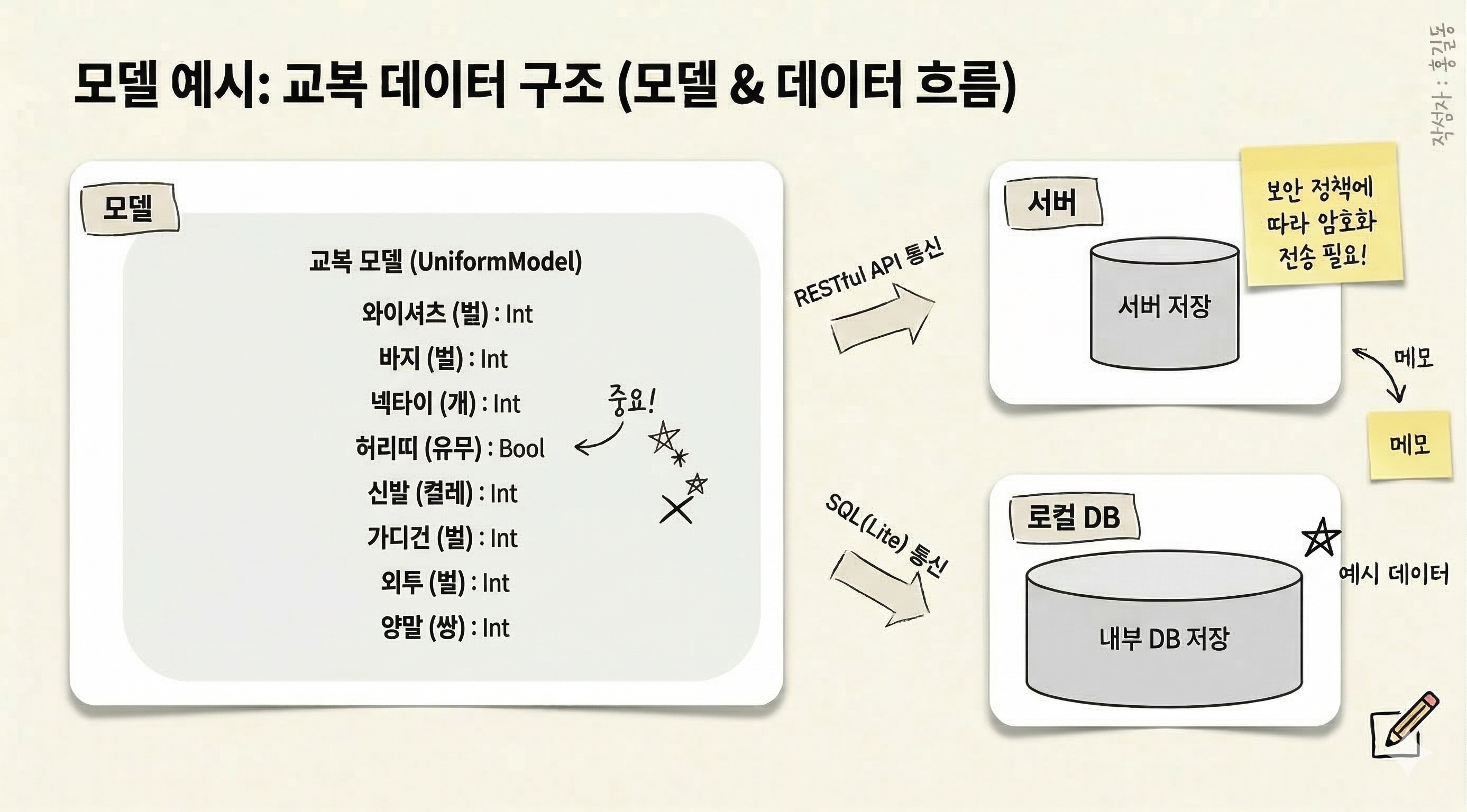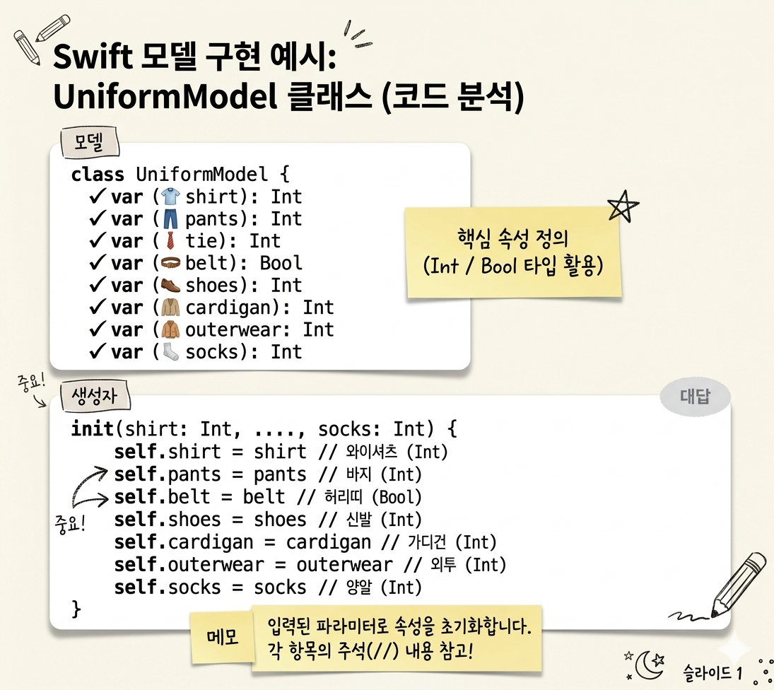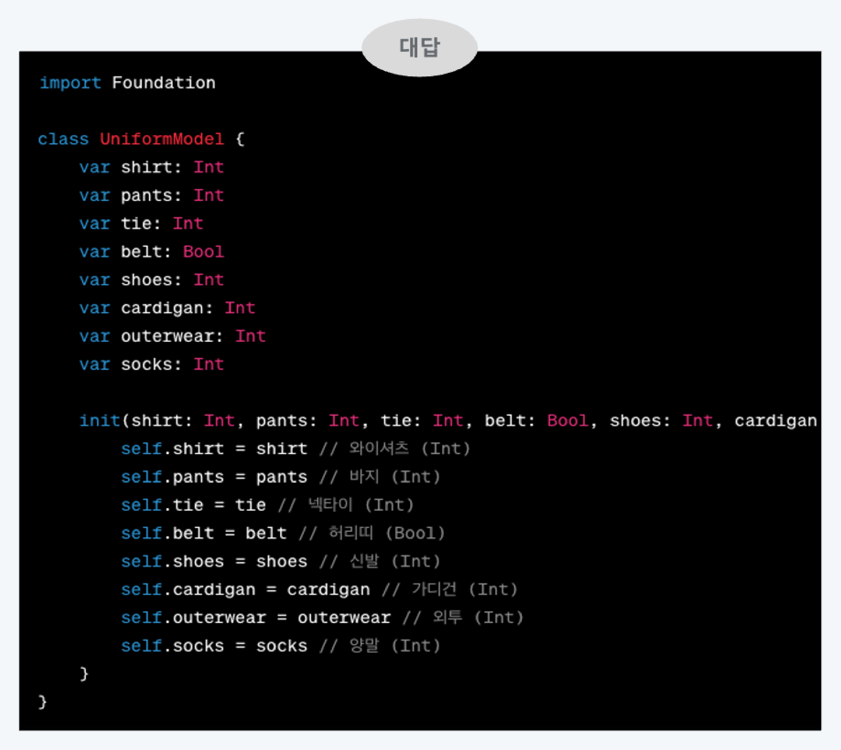 사진을 보면 교복과 관련된 데이터 모델 클래스를 생성하기 위해 여러 값을 지정해야 합니다. 이를 위해 ChatGPT에게 다음과 같이 명령했습니다: "UniformModel이라는 이름으로 Swift 모델 클래스를 만들 거야. 변수로 와이셔츠(Int), 바지(Int), 넥타이(Int), 허리띠(Bool), 신발(Int), 카디건(Int), 외투(Int), 양말(Int)을 선언해 줘."