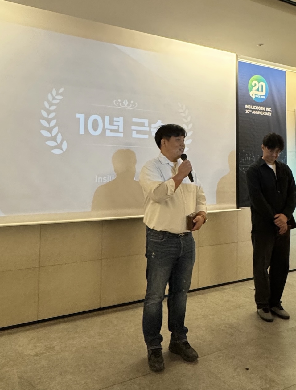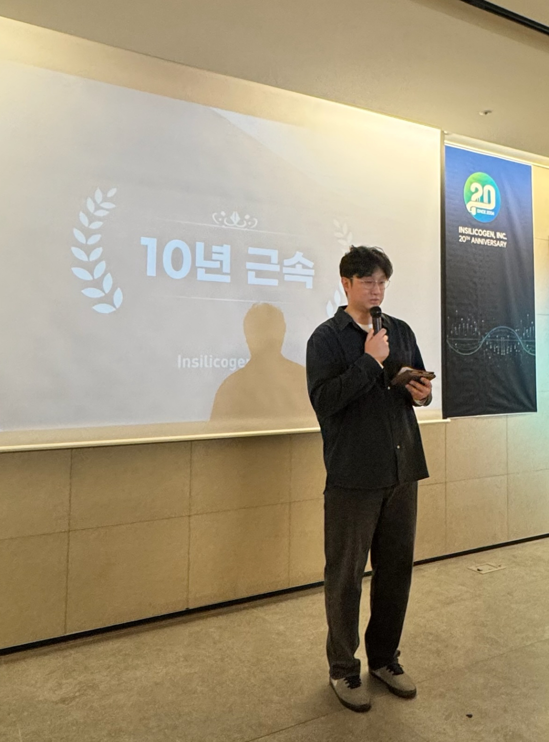 우선 인실리코젠 20주년을 진심으로 축하하며, 5년 동안 믿고 맡겨주셔서 감사합니다. 앞으로도 잘 부탁드리겠습니다. 처음 입사하고 5년, 10년 장기근속하신 분들을 봤을 때, 속으로 '와 어떻게 5년, 10년을 다녔지 대단하다'라고 생각했던 게 엊그제 같은데 이렇게 제가 5년 장기근속상을 받는 날이 왔네요. 주어진 일을 하면서 자연스레 달려오다 보니 5년이라는 시간이 흘러간 것 같습니다. 5년이라는 시간이 짧다면 짧고 길다면 긴 시간이지만, 그래도 5년 동안 묵묵히 제 자리에서 성과를 이루어가며 일한 제 자신을 칭찬하고 싶고, 5년 동안 일을 하면서 옆에서 도움 주신 분들에게는 감사의 인사를 드리고 싶습니다. 5년이라는 시간 동안 많은 분들과 일하면서 배운 것도 많고, 얻은 것도 많았다고 생각합니다. 특히 늘 그 자리에서 힘들 때나 기쁠 때나 같이 고민해 주고 위로해 주었던 iLAB 수장이신 김경윤 수석님께 감사하다고 말씀드리고 싶습니다. 감사합니다. 앞으로도 잘 부탁드리겠습니다. iLAB 부서원들께도 감사의 인사드립니다. 5년 장기근속상을 주신 게 5년 동안 밑바탕을 잘 만들었으니, 이제 앞으로 더 나아가라는 의미로 받아들이겠습니다. 지나온 5년을 발판 삼아 더욱 정진하도록 하겠습니다. 다시 한번 인실리코젠 20주년을 진심으로 축하하며, 5년 장기근속을 축하해 주신 모든 분께도 감사의 인사를 드립니다. 감사합니다. 더 노력하겠습니다.