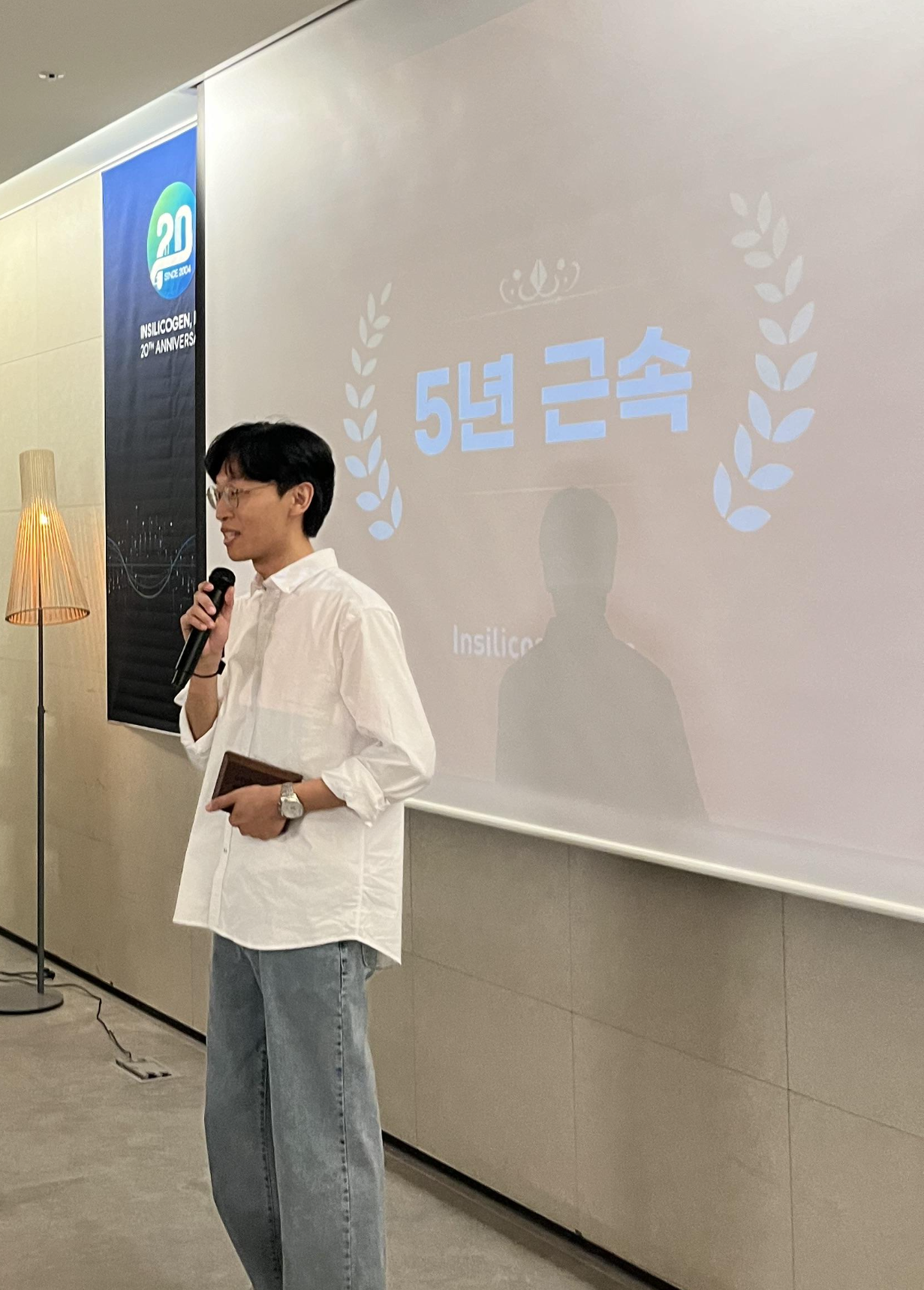 우선 인실리코젠 20주년을 진심으로 축하하며, 5년 동안 믿고 맡겨주셔서 감사합니다. 앞으로도 잘 부탁드리겠습니다. 처음 입사하고 5년, 10년 장기근속하신 분들을 봤을 때, 속으로 '와 어떻게 5년, 10년을 다녔지 대단하다'라고 생각했던 게 엊그제 같은데 이렇게 제가 5년 장기근속상을 받는 날이 왔네요. 주어진 일을 하면서 자연스레 달려오다 보니 5년이라는 시간이 흘러간 것 같습니다. 5년이라는 시간이 짧다면 짧고 길다면 긴 시간이지만, 그래도 5년 동안 묵묵히 제 자리에서 성과를 이루어가며 일한 제 자신을 칭찬하고 싶고, 5년 동안 일을 하면서 옆에서 도움 주신 분들에게는 감사의 인사를 드리고 싶습니다. 5년이라는 시간 동안 많은 분들과 일하면서 배운 것도 많고, 얻은 것도 많았다고 생각합니다. 특히 늘 그 자리에서 힘들 때나 기쁠 때나 같이 고민해 주고 위로해 주었던 iLAB 수장이신 김경윤 수석님께 감사하다고 말씀드리고 싶습니다. 감사합니다. 앞으로도 잘 부탁드리겠습니다. iLAB 부서원들께도 감사의 인사드립니다. 5년 장기근속상을 주신 게 5년 동안 밑바탕을 잘 만들었으니, 이제 앞으로 더 나아가라는 의미로 받아들이겠습니다. 지나온 5년을 발판 삼아 더욱 정진하도록 하겠습니다. 다시 한번 인실리코젠 20주년을 진심으로 축하하며, 5년 장기근속을 축하해 주신 모든 분께도 감사의 인사를 드립니다. 감사합니다. 더 노력하겠습니다.