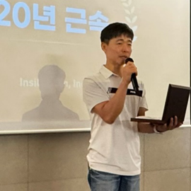 안녕하세요, 이상민입니다. 우선, 회사 창립 20주년을 진심으로 축하드립니다. 이런 뜻깊은 날 장기근속상을 받게 되어 매우 기쁘고, 회사가 설립된 절반의 시간을 함께할 수 있어 큰 영광입니다. 지난 10년간 함께 성장해 온 동료분들과 항상 올바른 방향으로 이끌어주신 대표님께 진심으로 감사드립니다. 앞으로도 변함없이 최선을 다해 회사가 더욱 성장하고 발전할 수 있도록 힘쓰겠습니다. 이 자리에 설 수 있도록 아낌없는 격려와 응원을 보내주신 모든 분께 다시 한번 감사드리며, 앞으로도 데이터 바이오 기업으로써 새로운 10년을 함께 만들어 가길 기대합니다.
