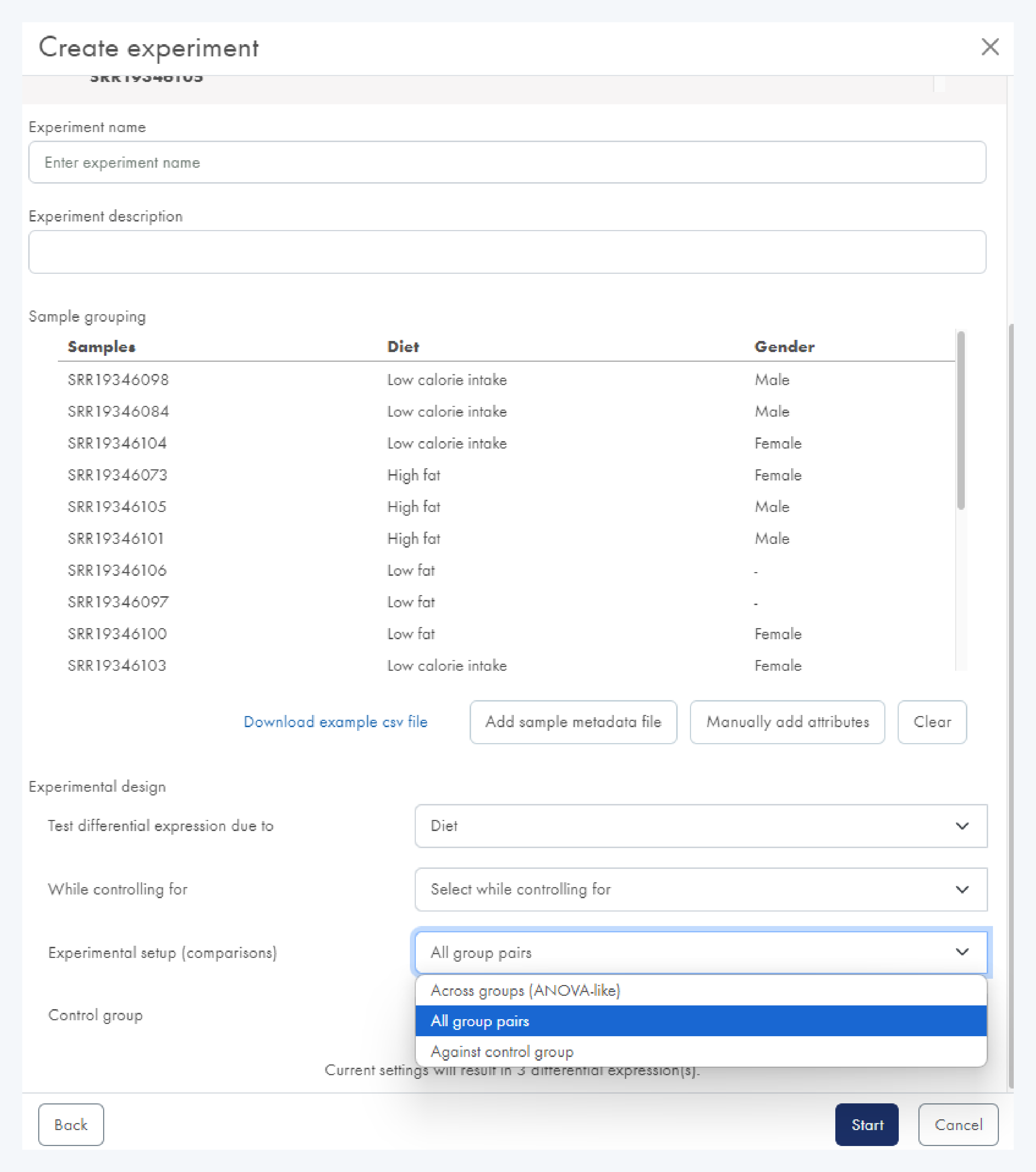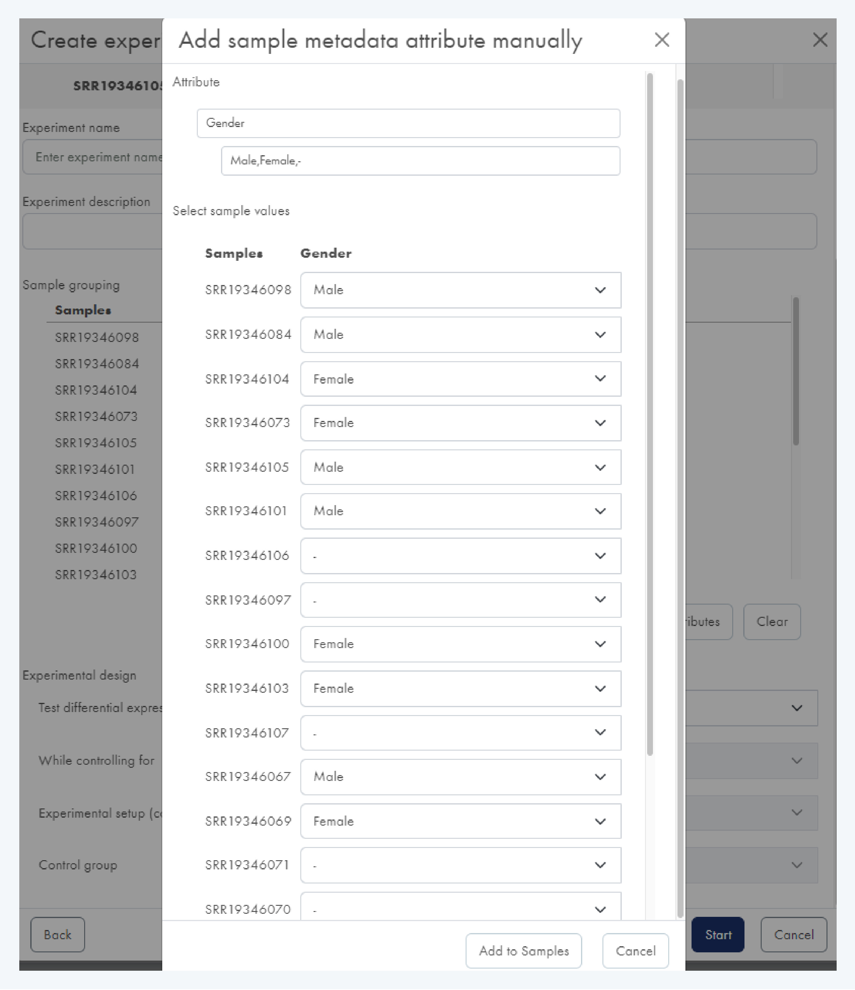 이 단계는 차등 발현에 사용할 샘플 선택, QC 리포트 만들기, 차등 발현 분석을 위한 그룹 선택이 진행됩니다. 여기서 메타데이터 파일이 있다면 이를 업로드하고, 없다면 Manually add attributes를 클릭하여 수동으로 그룹을 만들 수 있습니다. 컴마(,)를 통해 그룹을 구분할 수 있습니다.