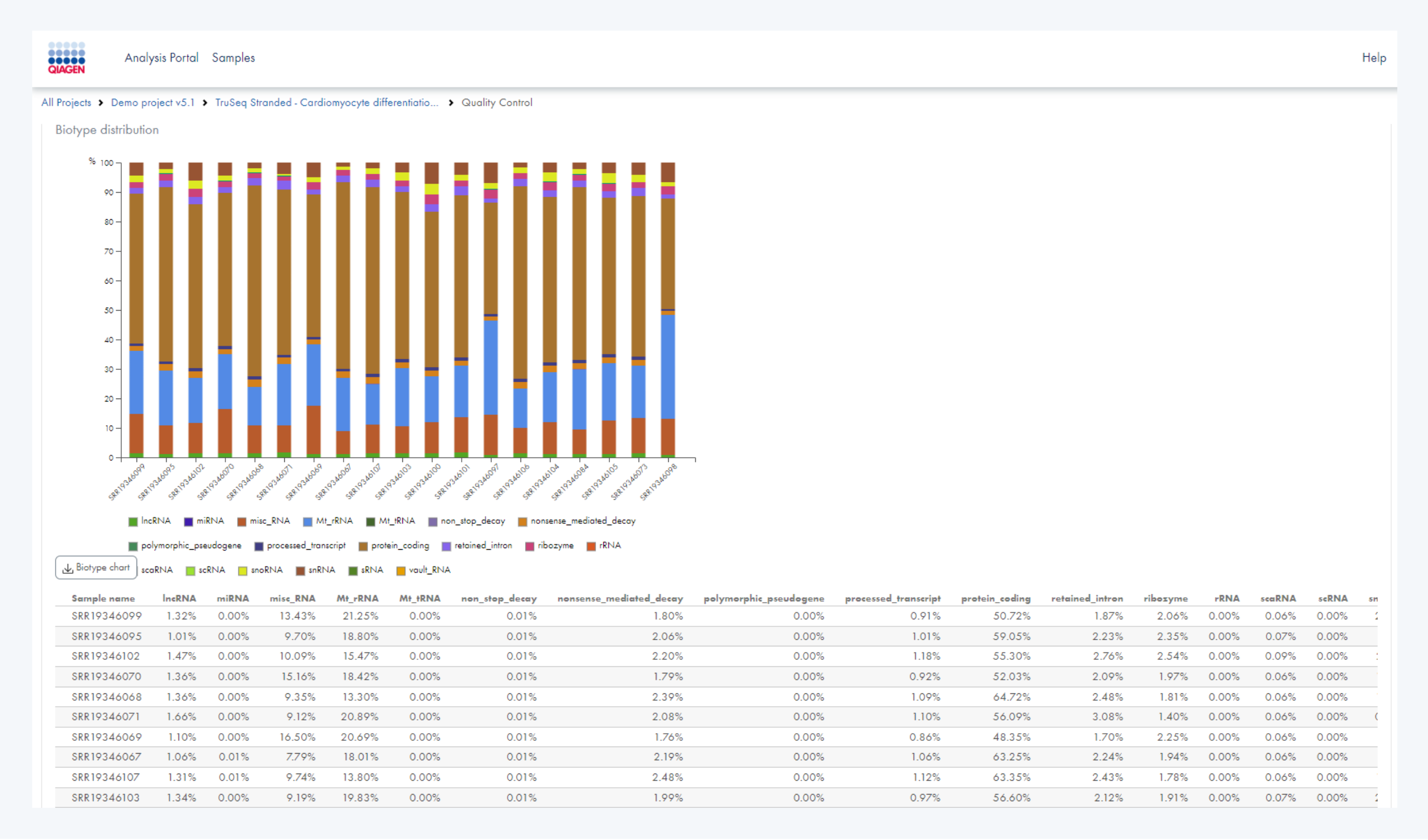 Quality Control 탭을 클릭하시면 QC 결과, Mapping 결과 및 그 type, Biotype의 분포와 unmapped 된 read가 많을 시 대략적인 taxanomic profile을 확인할 수 있습니다.