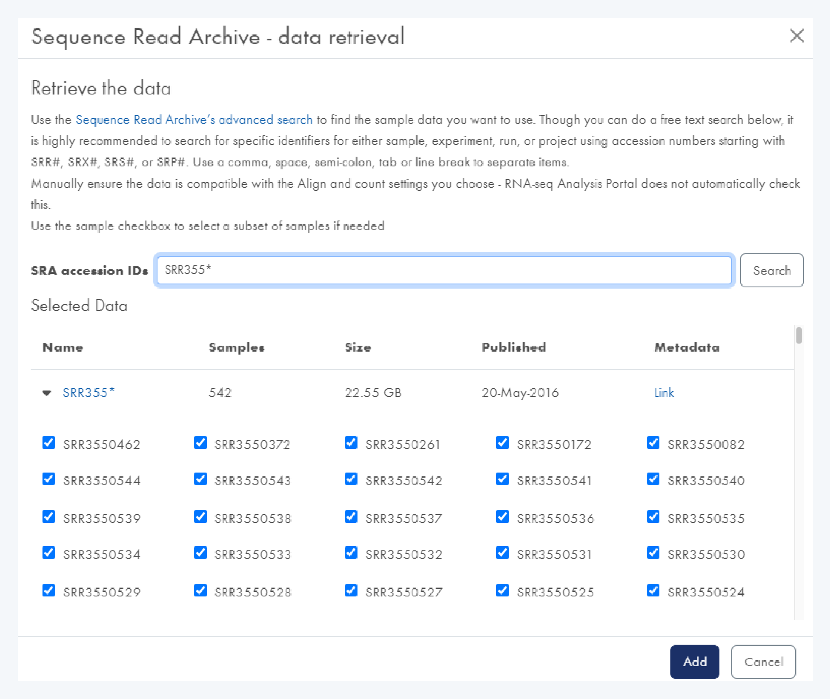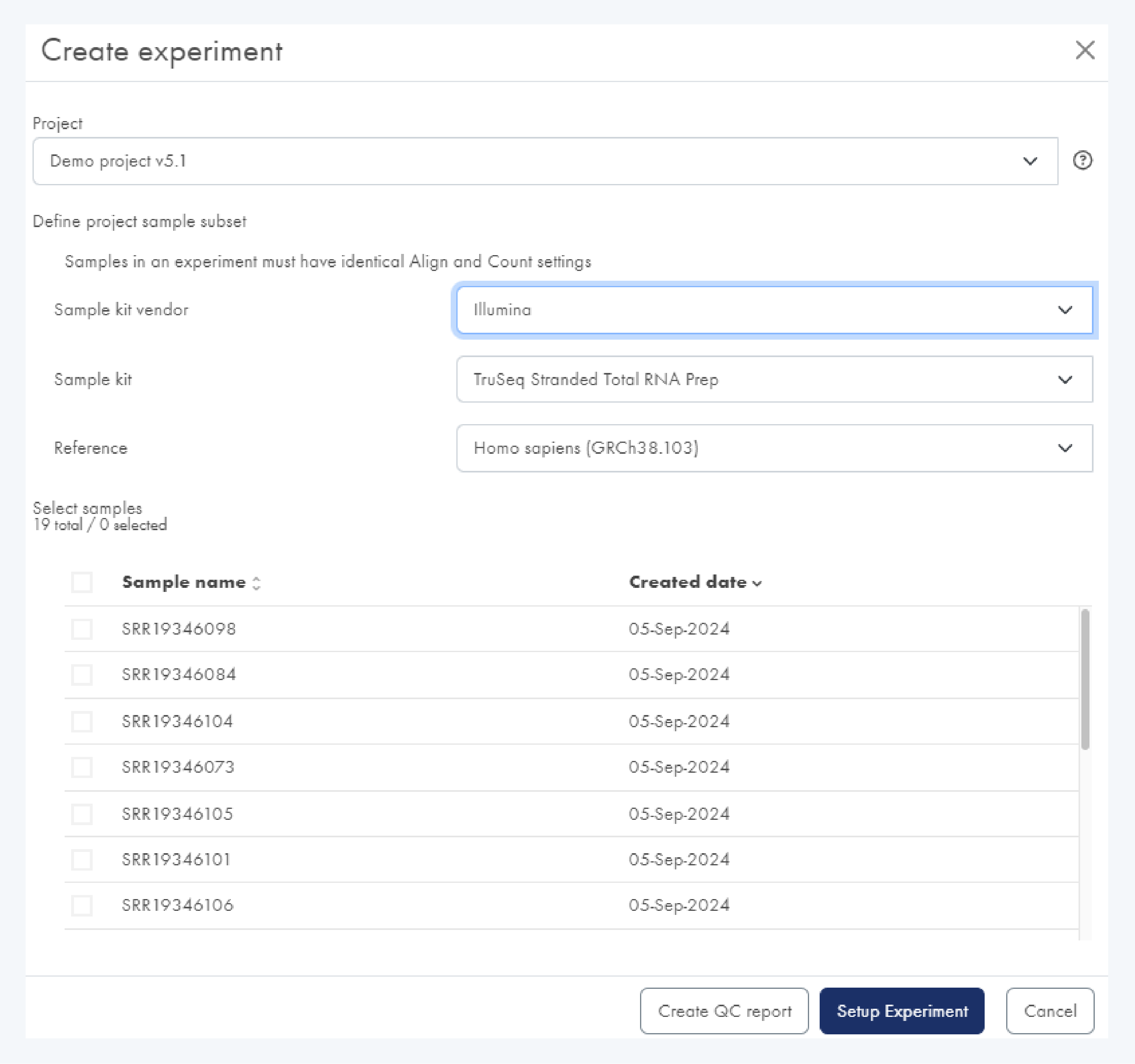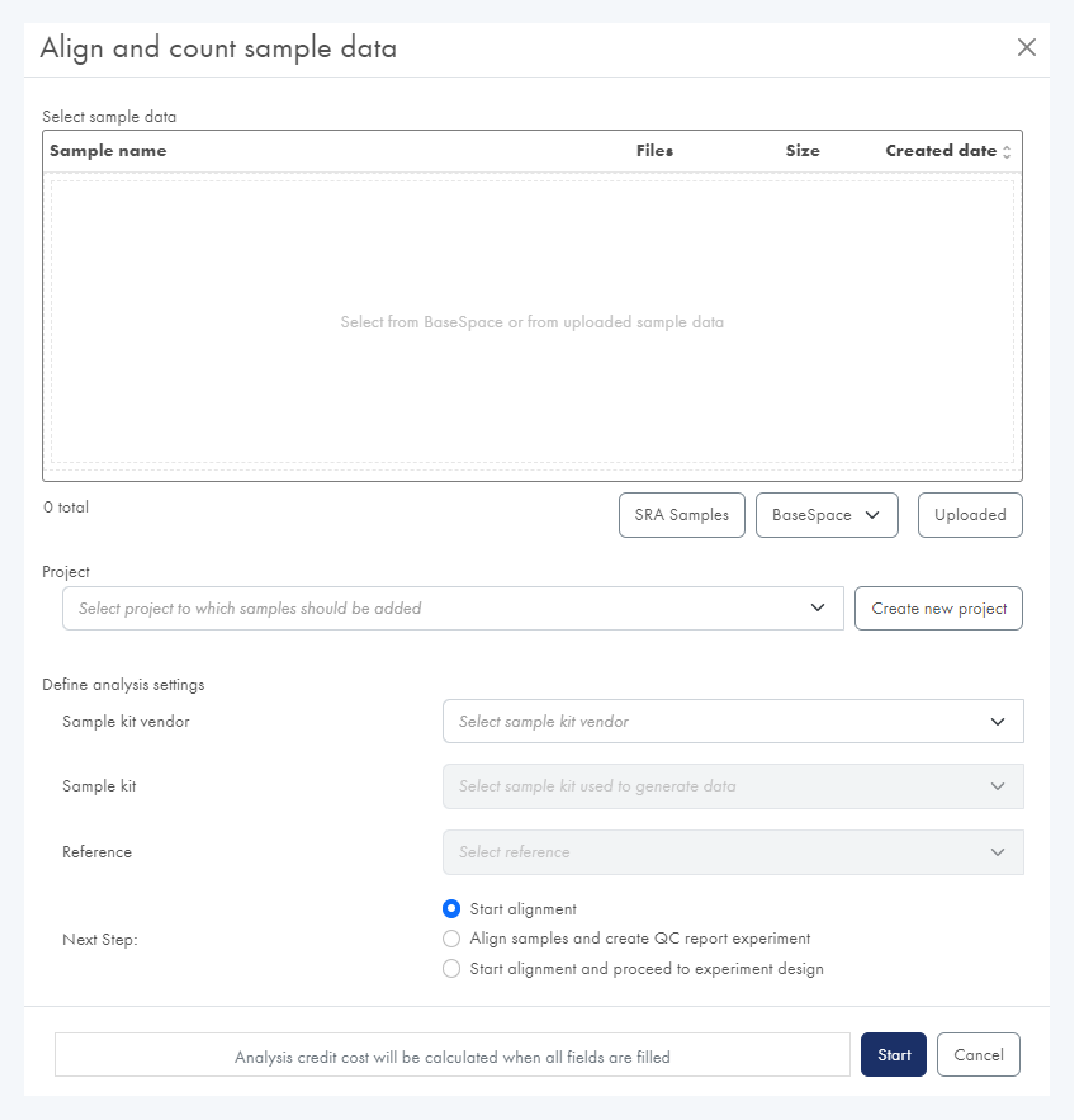 이 단계는 데이터를 분석하고 각 샘플에서의 발현 레벨을 생성합니다. 업로드한 데이터뿐만 아니라 SRA에 업로드된 샘플 및 Illumina BaseSpace에 저장된 데이터도 클라우드-클라우드 기반으로 전송하여 선택한 후 분석을 진행할 수 있습니다.