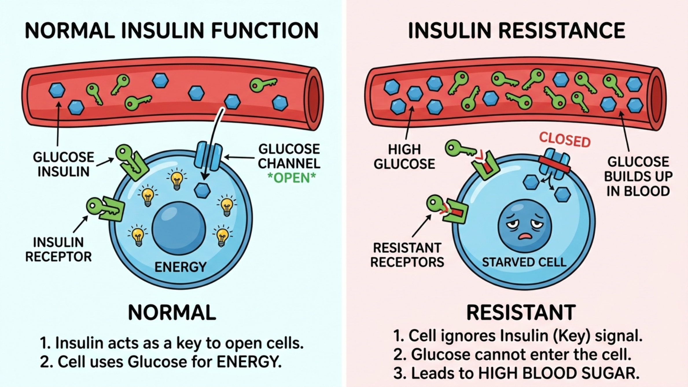 ※ 인슐린 저항성(insulin resistance): 체내 세포들이 인슐린에 대한 반응이 둔화되어, 혈당을 효과적으로 조절하지 못하는 상태를 말합니다. 일반적으로 인슐린은 혈액 속의 포도당을 세포로 이동시켜 에너지로 사용하거나 저장하도록 돕습니다. 하지만 인슐린 저항성이 발생하면 세포들이 인슐린에 덜 반응하게 되어, 혈당 수치가 높아지게 됩니다. 이러한 이유로 고혈당, 심혈관 질환, 체중 증가 등이 발생할 수 있습니다.