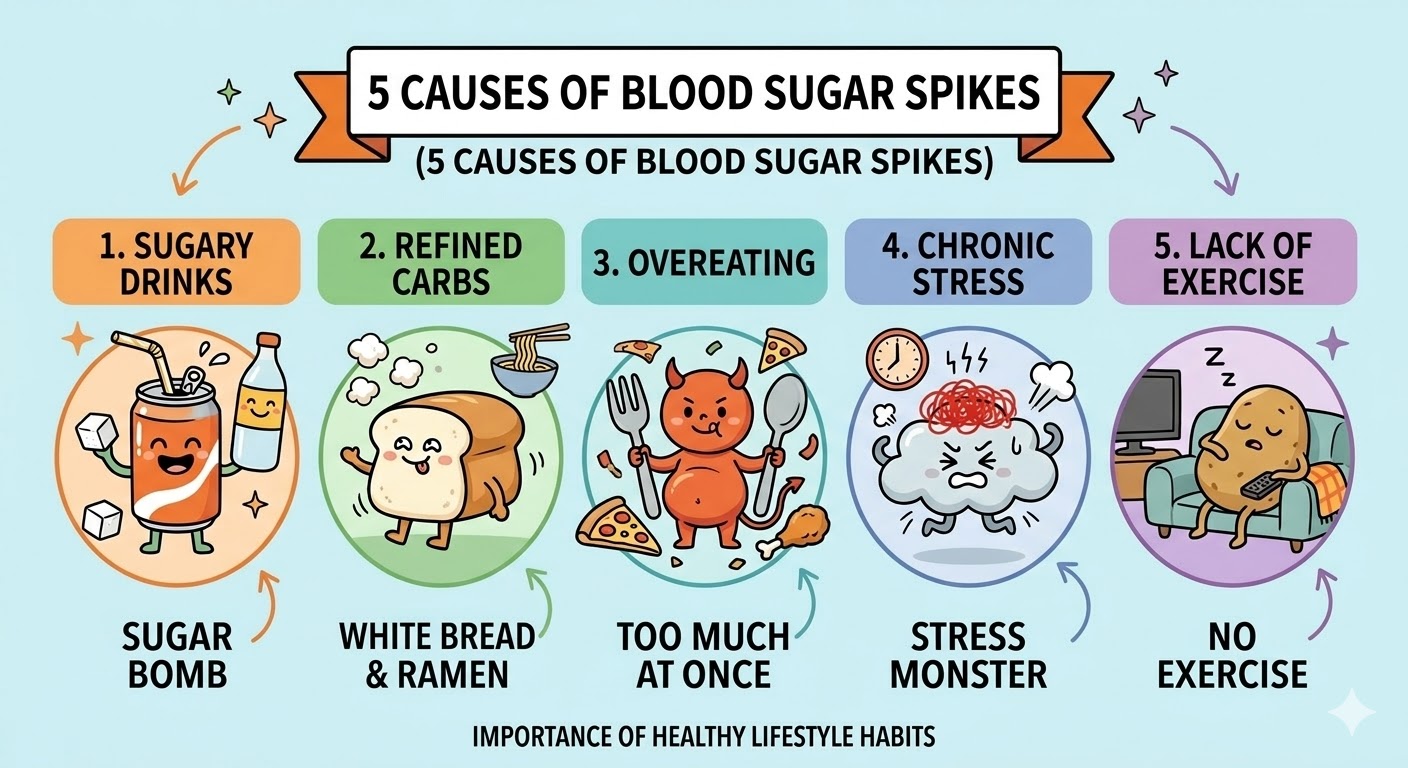혈당 스파이크의 원인으로는 불규칙한 식사와 과식, 단순당 위주의 식사, 운동 부족, 수면 부족 및 스트레스 등이 있습니다.