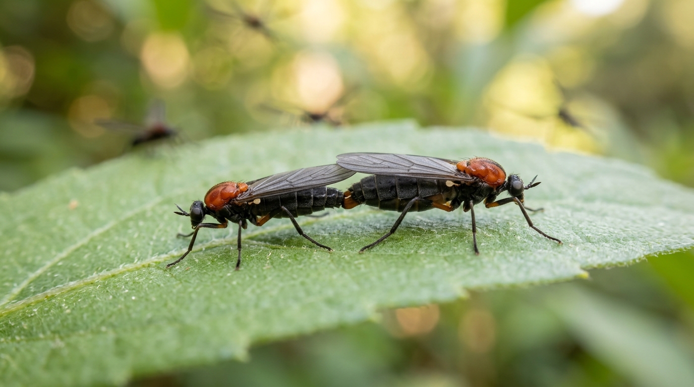 러브버그(붉은등우단털파리)의 암수가 함께 붙어 있는 모습
