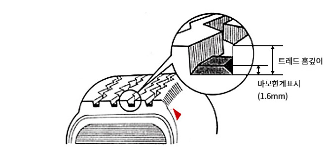타이어 트레드(접지 면)에는 마모 한계선을 나타내는 지표가 새겨져 있습니다. 일반적으로 트레드의 홈 사이에 새겨지는 막대형 지표와 트레드와 사이드월 경계 면에 새겨지는 삼각형 지표가 있습니다.