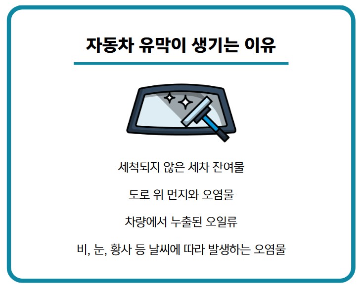 유막이란 자동차 유리 표면에 운행 중 달라붙은 배기가스의 찌꺼기나 왁스, 기름기 등이 얇은 막의 형태로 코팅된 상태를 말합니다. 유막이 쌓이면 차창이 뿌옇게 보여 시야가 흐려집니다. 이 같은 현상은 특히 비가 내리거나 습한 날씨에 더욱 심해지기 때문에 여름철에 특히 신경 써서 관리해 주어야 합니다.