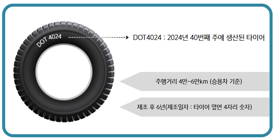 일반적으로 승용차를 기준으로 약 4만~6만 km 주행 후 타이어를 교체하는 것이 좋습니다. 만일 고속도로를 자주 이용한다거나 험로 주행, 급가속이나 급제동 등 주행 환경이 좋지 않다면 교체 주기는 더 짧아질 수 있으니 정기적인 확인이 필요합니다. 또한, 제조 후 6년 이상 지난 타이어는 고무가 경화되어 탄성이 저하되고 균열이 생길 수 있기 때문에 주행거리와 관계없이 교체해 주는 것이 좋습니다. 타이어의 제조 일자는 타이어 옆면의 4자리 숫자로 확인할 수 있습니다. 앞의 2자리 수는 생산한 주, 뒤의 2자리 수는 생산연도를 의미합니다.