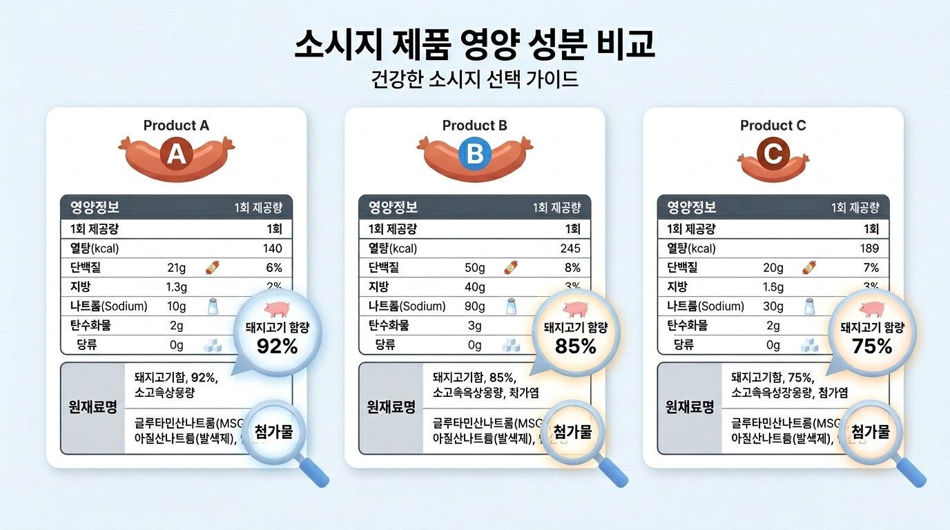 세 가지 제품들의 원재료를 살펴보면 겉보기엔 거의 비슷하지만, 주 원재료인 돼지고기 함량이 10%가량 차이 납니다. 이때 체크해야 할 포인트는 단순한 함량이 아니라, 돼지고기 부위와 원산지입니다. 소시지는 보통 지방이 많고 단가가 낮은 부위(전지·후지·혼합육 등)를 사용하기 때문에, ‘돼지고기(앞다리살, 국내산)’처럼 구체적인 부위와 원산지가 명시된 제품이 더 신뢰도가 높습니다.