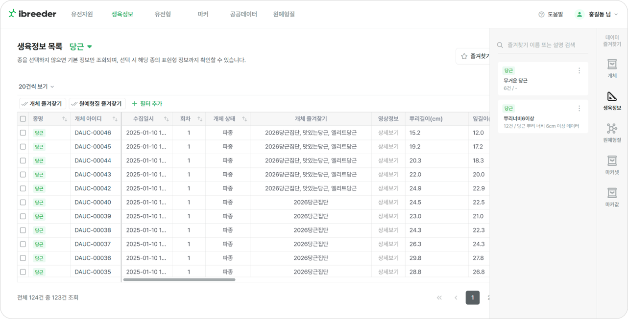 즐겨찾기에 등록된 개체는 이런 반복적인 조회 속에서도 연구자의 흐름을 끊지 않고, 연구자의 우선순위에 따라 자원을 관리할 수 있게 함으로써, 연구자가 육종에 더 몰입할 수 있는 환경을 선사합니다.