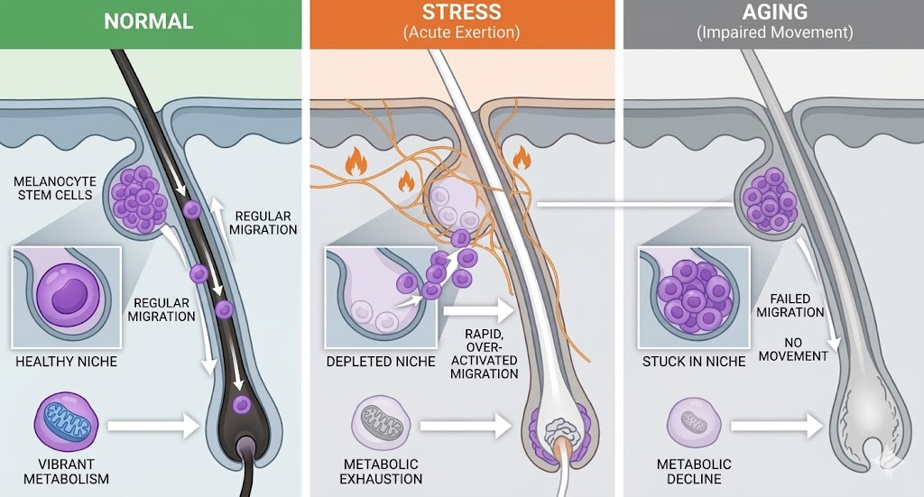 핵심은, 이 줄기세포 풀(pool)이 고갈되거나 기능을 잃으면 색소를 만들 세포가 보충되지 않아 흰 머리카락이 나온다는 것입니다.
