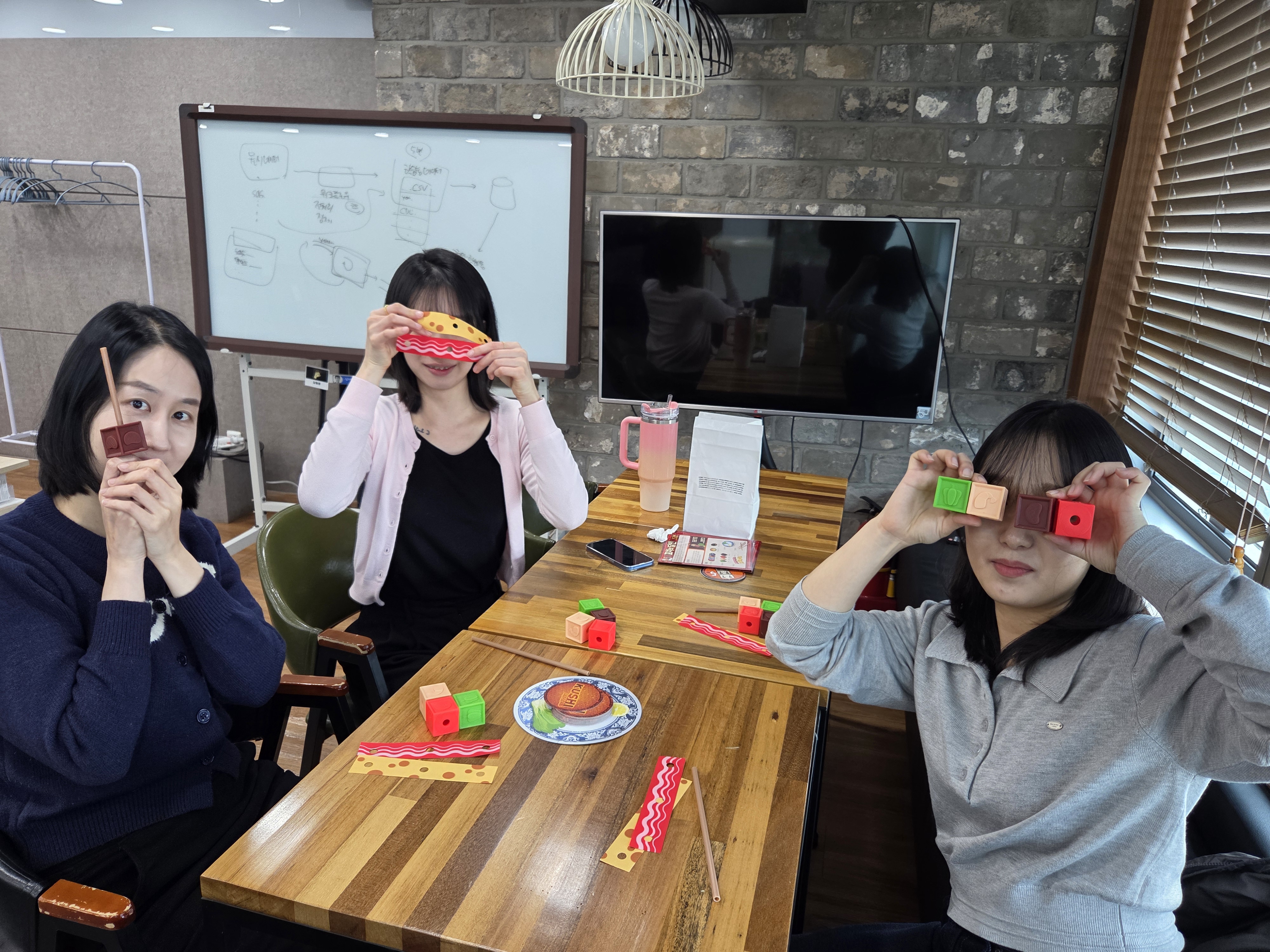 뽑은 카드에 맞게 꼬치 재료를 빠르게 끼우는 게임으로, 가장 먼저 완성하는 사람이 점수를 가져가는 방식인데요. 가볍게 시작한 게임이었지만, 어느새 모두가 승부욕에 불타오르며 분위기가 한층 뜨거워졌습니다.