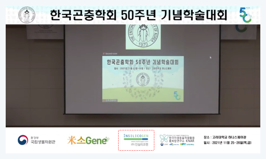 저희 (주)인실리코젠은 지난 11월 26일 고려대학교 하나스퀘어에서 진행된 한국곤충학회 50주년 기념학술대회(고려대학교 곤충연구소 주관)를 후원한 바 있는데요,