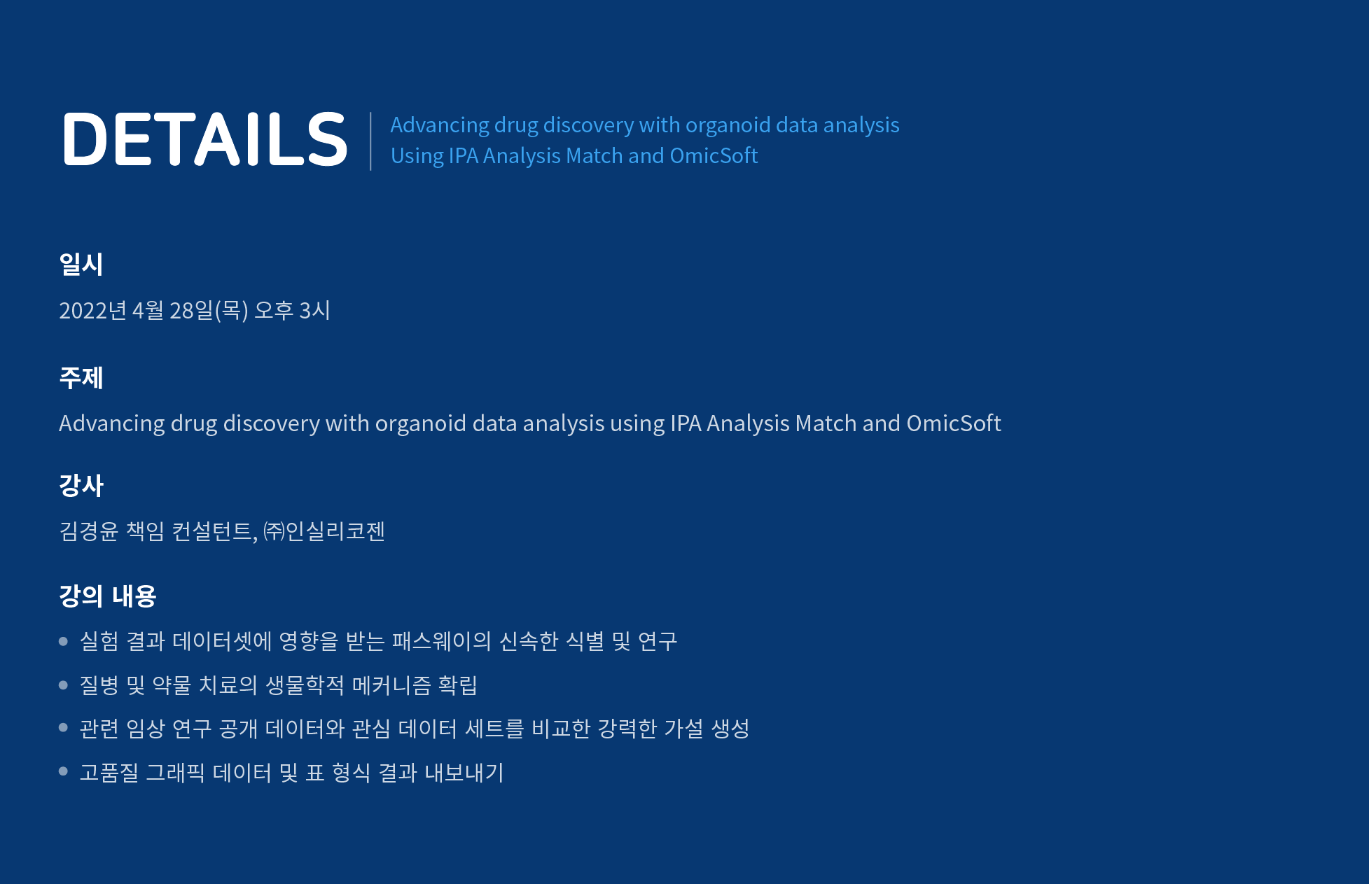- 주제 : Advancing drug discovery with organoid data analysis using IPA Analysis Match and OmicSoft