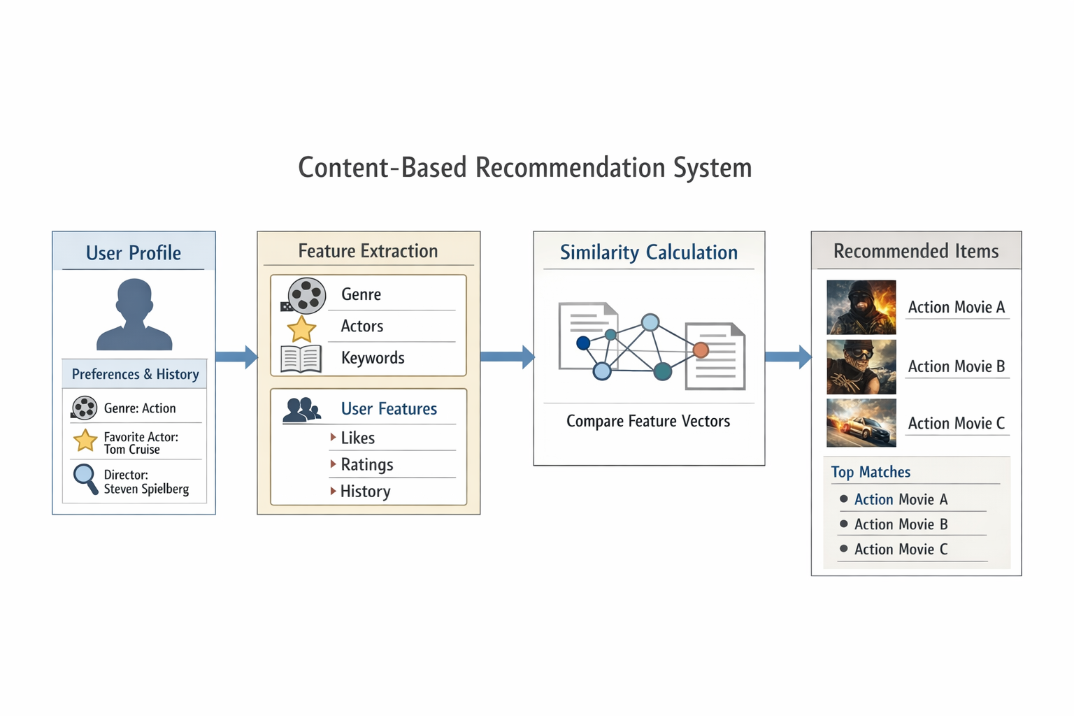 콘텐츠 기반 추천 시스템은 아이템에 대한 세부 정보를 토대로 사용자가 과거에 소비했던 콘텐츠와 유사한 콘텐츠를 추천해주는 방식입니다. 아래 그림처럼 사용자가 이전에 높게 평가했던 콘텐츠(빨간색)와 가장 유사한 콘텐츠(파란색)를 추천해주는 방식이라고 생각하면 됩니다.