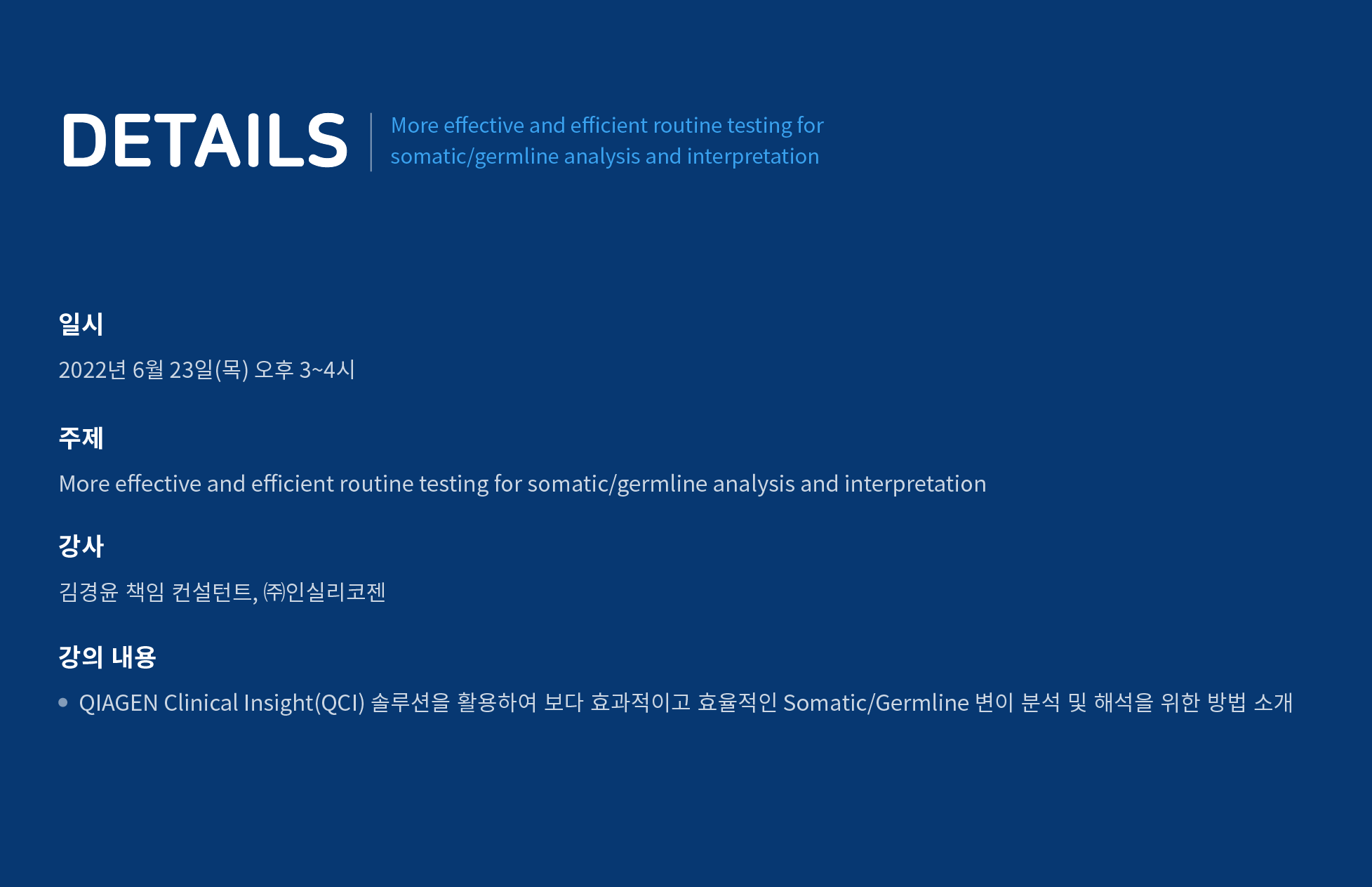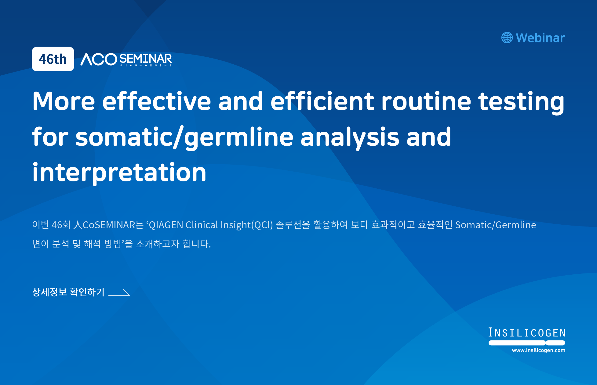 이번 46회 人CoSEMINAR는 Qiagen Clinical Insight (QCI) 솔루션을 활용하여 보다 효과적이고 효율적인 Somatic/Germline 변이 분석 및 해석 방법을 소개하고자 합니다.