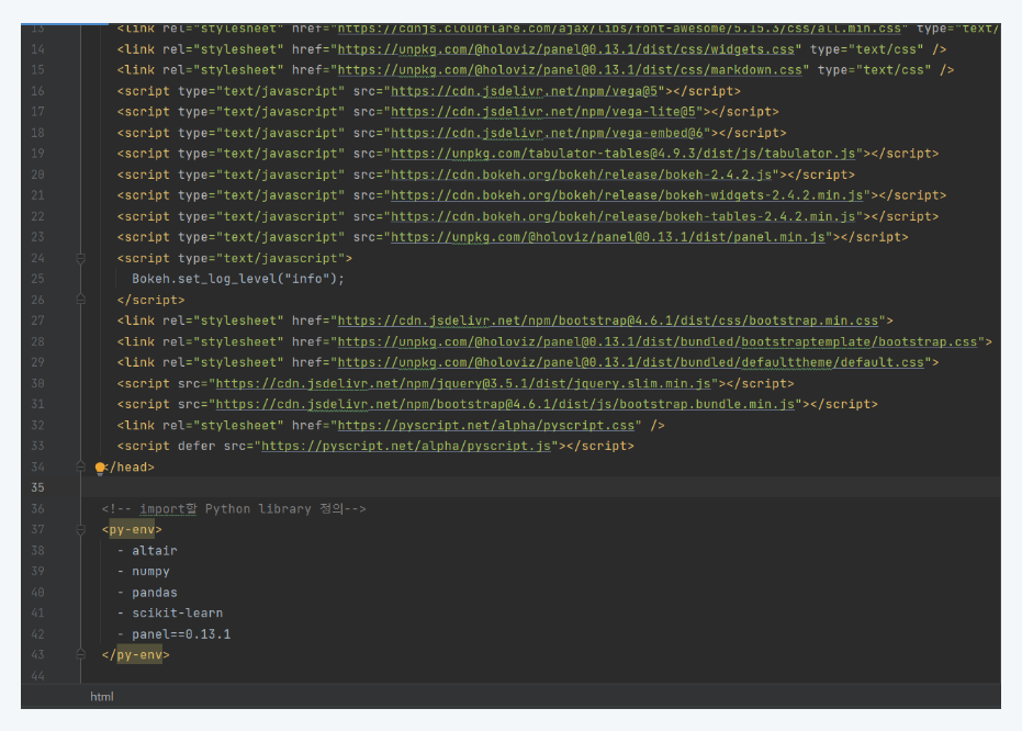 외부 py 파일을 import할 경우 <py-env> 태그 내에 - paths: url을 작성하거나 <py-script src='url'>을 작성하여 import 합니다.