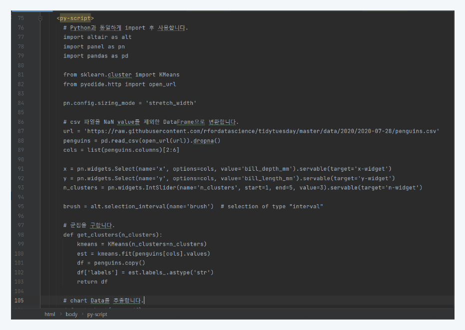 두 번째로 py-script 태그 안에 Python Code를 작성합니다. python library를 import 하는 방식과 문법은 같습니다.