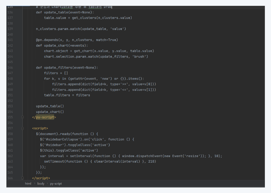 이 예제는 scikit-lean을 사용하여 펭귄의 데이터 세트를 K-mean clustering을 출력하고 클릭한 plot 그래프 좌표에 대한 정보를 표로 출력합니다. Python 기반이다 보니 DataFrame 파싱, 머신러닝, 시각화하는 과정에서 runtime이 길어지긴 하지만 JavaScript의 async를 활용하면 해결될 것으로 보입니다.