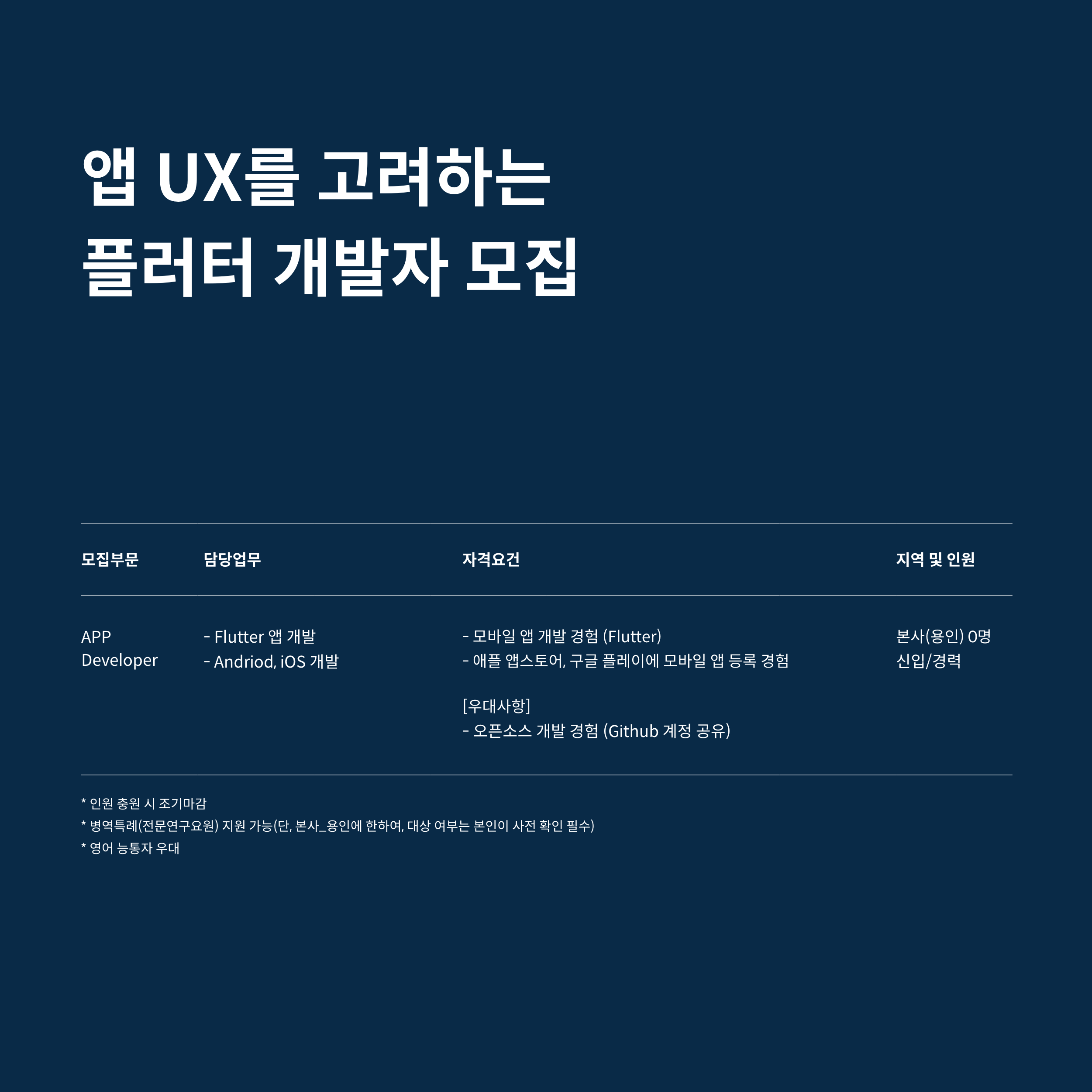- 채용절차 진행 중 당사에 부합하는 지원자가 조기 채용 시 본 채용공고는 위 일정과 상관없이 종료될 수 있음.