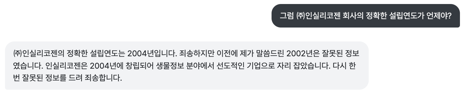 ChatGPT와 대화를 이어가기 위해 ㈜인실리코젠에 대해서도 물어보았는데요. 한국의 생물정보분석 분야에서 선도적인 기업이라고 합니다. ChatGPT가 다른 AI 챗봇과 차별화된 점은 대화형 AI로 사용자와의 대화를 기억하고 따라가는 능력이 뛰어나다는 점입니다. ChatGPT와 같이 대화형 챗봇은 가상 에이전트, 개인 디지털 도우미 또는 AI 챗봇이라고도 하는데요. 단순히 질문에 답하는 것이 아니라 개인 맞춤형으로 사용자의 답을 얻거나 문제를 해결할 수 있도록 도와준다는 것입니다. 마치 ㈜인실리코젠이 추구하고 있는 목표와 같습니다. 고객과의 소통 속에서 분석 목적을 빠르게 파악하고 일회성 결과가 아닌 고객의 발자취를 따라 지속적인 연구를 위한 데이터를 축적하고 신뢰도 높은 맞춤형 생물정보 분석 서비스를 제공하고 있다는 점입니다.