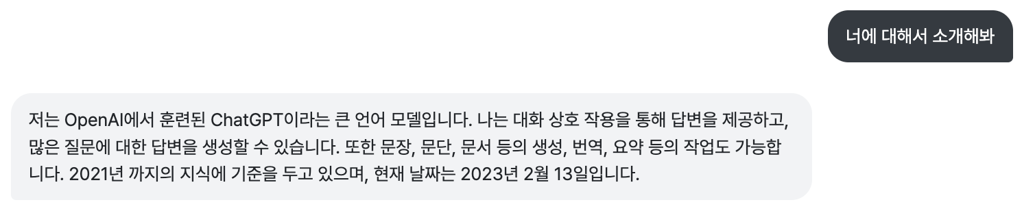 저도 회원가입 후 ChatGPT-3.5 에게 자신을 소개해달라고 대화를 시도해 보았습니다. OpenAI에서 훈련된 언어 모델로, 대화 상호 작용을 통해 답변을 제공하고 다양한 토픽에 관해서 대화할 수 있다고 답하였습니다. 또한 뉴스와 여러 매체에서 접한 정보처럼 문서 생성, 번역, 요약 등의 작업도 가능하다고 하며 2021년 9월까지의 데이터베이스를 기준으로 두고 있다고 합니다.