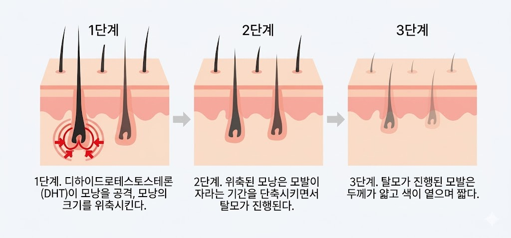 - 남성형 탈모(M자형, 정수리 형) : 탈모는 디하이드로테스토스테론(DHT)이라는 탈모 호르몬 때문에 남성형 탈모가 옵니다. 신기한 건 이 호르몬은 머리카락은 얇아지게 만들면서 눈썹 아래로는 두껍게 만든다고 합니다.